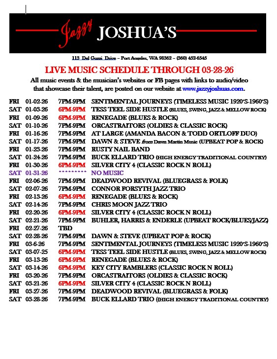 Jazzy Joshua's Restaurant & Lounge 113 Del Guzzi Dr, Port Angeles, WA, United StatesClick the band name on the splash page for a map with directions to Jazzy Joshua's & a link to Christine Moon's website where you will find additional information & […]